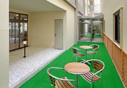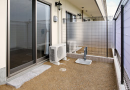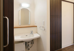 洋室の個室。エアコン、キッチン、洗面、トイレを備えた機能的な部屋は、自分らしさを大切にしたいという方にぴったりな完全個室。落ち着いたブラウンと清潔なホワイトのカラーバランスも見事です。新居住楝には、専用庭付きの個室もあります。戸建感覚でガーデニングやティータイムなど、思い思いの時間を楽しめます。